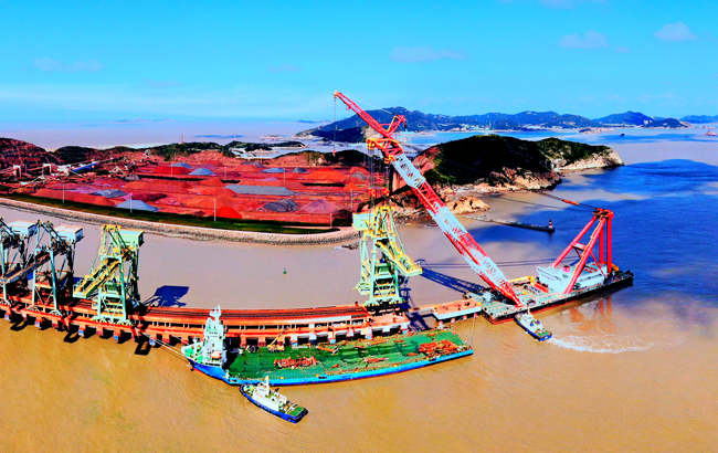 日前,中国宝武宝钢股份运输部马迹山港两台自重为1950吨的抓斗式卸船机一次吊装成功,创造了国内典型外海开敞式深水港口超大型港机设备整机吊装的新纪录。两台新卸船机的卸船能力均为2500吨/小时,大大提升了马迹山港卸船作业能力。图为马迹山港码头吊装现场。(张勇 忻永恩 摄)