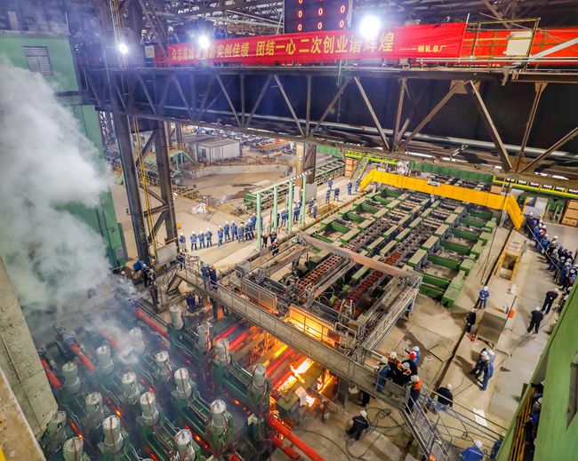 12月20日下午3时08分,随着引锭杆缓缓拉出重型H型异形连铸坯,标志着马钢重型H型钢异型坯连铸机热负荷试车圆满成功,第一根国产重型H型连铸坯在马钢诞生。据悉,马钢重型H型钢产线是我国第一条热轧重型H型钢生产线,设计年产量79万吨,产品主打目前国内所缺的重型系列、厚壁系列、宽翼缘系列等高附加值H型钢产品。图为热负荷试车现场。(张泓 李忠好 摄)
