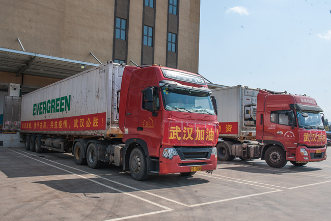 2月20日下午,两辆满载着55吨急需生活物资的大型货车,准备从昆钢宝象万吨冷链港前往湖北省武汉市(如图)。新冠肺炎疫情发生后,昆钢宝象万吨冷储物流有限公司紧急行动起来,调集了价值126.5万元武汉市急需的猪肉、鸡肉、牛肉及速冻食品55吨,并组织车辆运送。(李照峰 缪金成 摄)