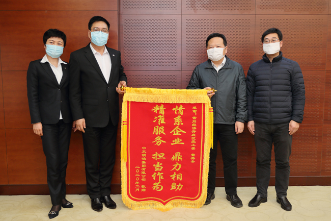 2月26日,中天钢铁领导向常州市经济开区党工委送上锦旗,表示感谢(如图)。新冠肺炎疫情发生以来,常州市经济开发区想企业之所想、急企业之所急,多次赴中天钢铁现场办公、深入调研,在防疫物资、物流运输等方面,指导企业开展疫情防控工作,有效保障中天钢铁生产的正常有序。(记者 朱元洁 通讯员 陈明 摄)