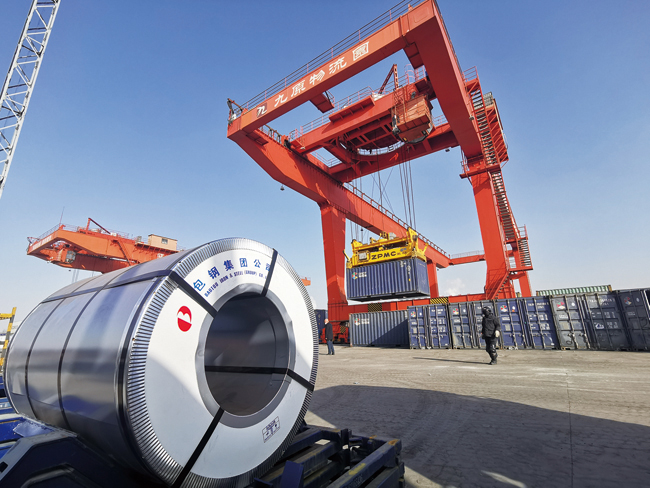 今年以来,包钢公、铁、海集装箱物流联运凭借与中国远洋海运集团签署的战略合作协议优势,以及自身所具有的自动化程度高、人工密集度小等特点,集装箱发送量不断提升。据统计,1月1日~2月25日,包钢发运432个集装箱产品。图为包头市九原区物流园区包钢货场正在装运包钢冷轧板材产品。 (记者 白立新 摄)