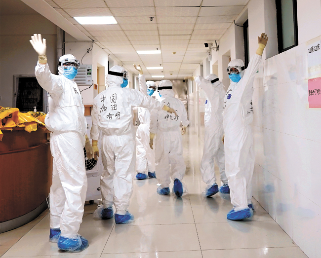 3月6日,新钢中心医院医护人员圆满完成了江西省新余市新冠肺炎患者的救治任务,医务人员在对病区消毒、整理后,正式撤离至新余市袁河宾馆开始集中隔离。自2月12日起,新钢中心医院17名医护人员连续奋战24天,采用中西医结合的方法,成功救治新冠肺炎临床诊断病例患者10名。图为部分医护人员向隔离病区挥手告别。 (欧阳斯娟 摄)