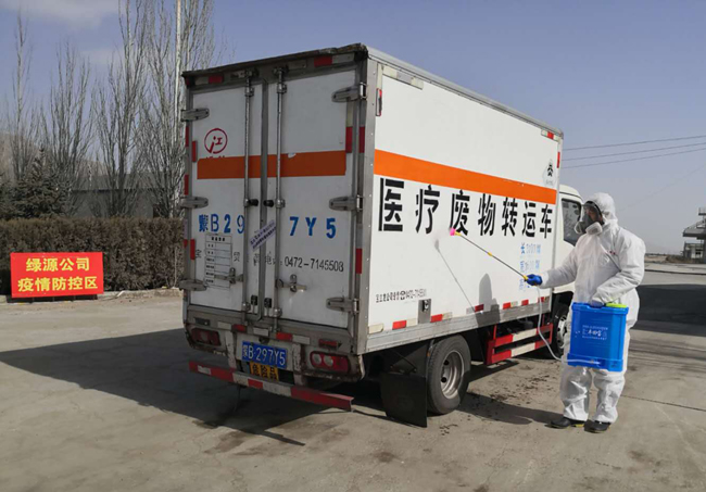 新冠肺炎疫情发生以来,包钢绿源公司承担着包头市92家单位医疗废物的处置工作,其中重点对疫区医疗废物优先入厂,疫情医废单独称重、单独记录、单独处置、单独堆放。据统计,1月26日至3月19日,绿源公司累计处置医废189.92吨,其中疫情医废19.37吨,安全把住包头疫情防控最后一道关。图为该公司工作人员正在为医疗废物转运车消毒。(记者 白立新 摄)