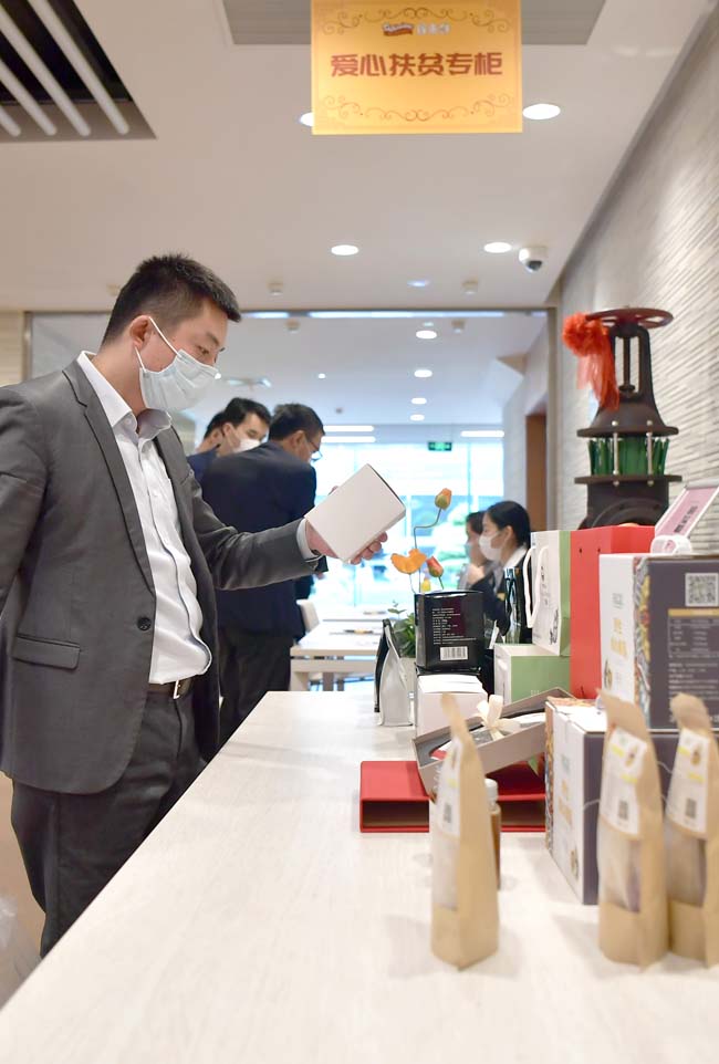 新冠肺炎疫情发生后,中国宝武针对定点扶贫和对口支援县农副产品滞销问题,组织总部员工带头开展消费扶贫行动。截至目前,中国宝武共采购滞销的农副产品322.88吨,员工们可以在享受“绿色”和“美味”的同时,以实际行动助力决战决胜脱贫攻坚。图为宝武职工在宝武总部“爱心扶贫专柜”前挑选农副产品。(特约通讯员 张勇 摄)