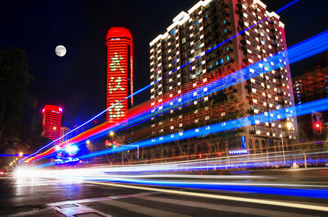 4月8日,因新冠肺炎疫情“封城”76天的武汉市“解封”。此刻,武汉市和平大道流光溢彩,明月见证着这座英雄城市的苏醒。该市将有序恢复铁路、民航、水运、公路运行,“九省通衢” 的大门重新敞开。 (本报记者 朱旺春 摄)