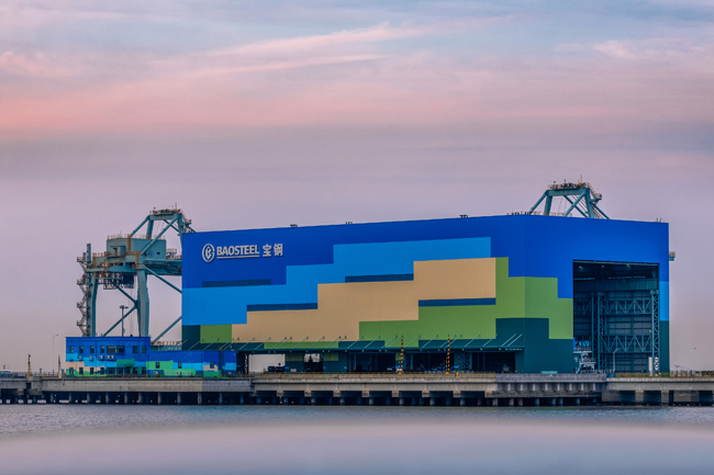 4月15日,在位于上海市宝山区北部长江口水道南岸的宝钢全天候码头上,中国宝武宝钢股份装卸船正在钢结构船库里作业(如图)。
