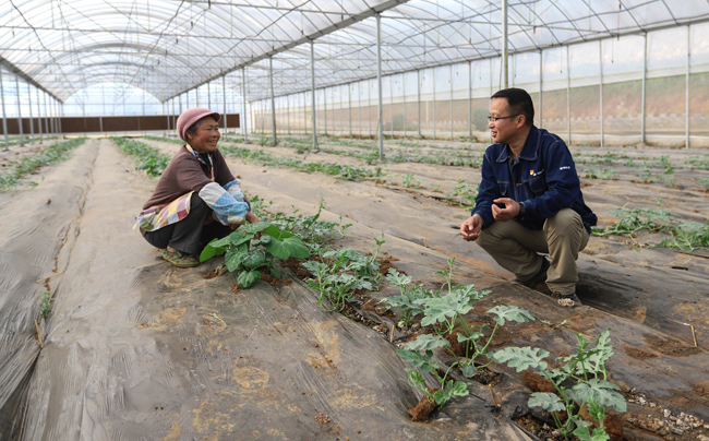 4月10日,贵州省盘州市刘官街道瞿家庄村果蔬大棚内,新栽种的西瓜苗长势良好,这是鞍钢集团攀钢在对口扶贫村开展产业扶贫的又一新举措。截至目前,攀钢在瞿家庄村援建标准化果蔬钢架大棚8000平方米,惠及868户2868人,其中贫困人口160户558人。图为攀钢扶贫干部何凯(右)在果蔬大棚里向村民了解西瓜生长情况。(记者 孟祥林 文 通讯员 何仁江 摄)