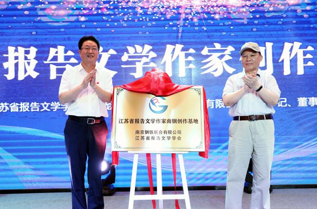 7月18日,首届“南钢·江苏报告文学奖”颁奖大会在南京钢铁联合有限公司举行。经评委会初评、复评,从申报的243部(篇)作品中遴选出90部入围作品,最终评选出42部(篇)获奖作品。据悉,今后将每3年举行一次评奖活动,并建立江苏省第一个报告文学作家创作基地。图为南钢党委书记、董事长黄一新(左)和江苏省报告文学学会会长庞瑞垠共同为“江苏省报告文学作家南钢创作基地”揭牌。(特约通讯员 吴斌 摄)