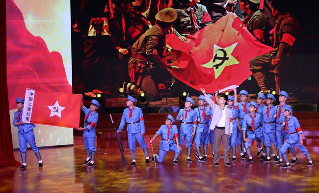 7月21日晚,第十四届湘钢文化节“不忘初心,牢记使命”红色家书经典诵读会在华菱湘钢举行。这次红色家书经典诵读会是湖南省总工会部署的“湘悦读·工力量”2020 年全省职工主题阅读活动重要内容。通过诵读经典,坚定湘钢人不忘初心、牢记使命“建设好毛主席家乡钢厂”的信念。图为湘钢职工在表演情景剧《三湾,那一夜》场景。(胡石强 摄)