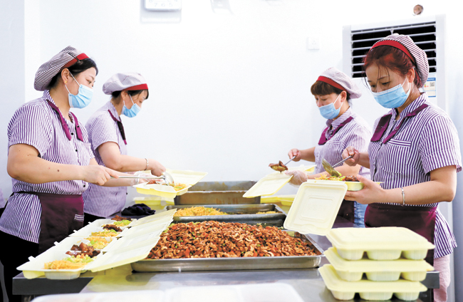 8月18日,南钢机关食堂工作人员正在对烹饪好的菜肴进行分装打包,倡导人人争做“光盘达人”,坚决制止餐饮浪费行为(如图)。为深入贯彻落实习近平总书记关于制止餐饮浪费行为的重要指示精神,南钢率先在机关食堂推行“提前订餐、按需采购、精准供餐”模式,食堂提前一周公布每日菜谱,职工提前一天预约订餐,食堂根据订餐数量合理采购食材进行烹饪制作,每天提供两种6元和两种8元的套餐近800份,可满足不同职工的个性化就餐需求。(特约通讯员 吴斌 摄)