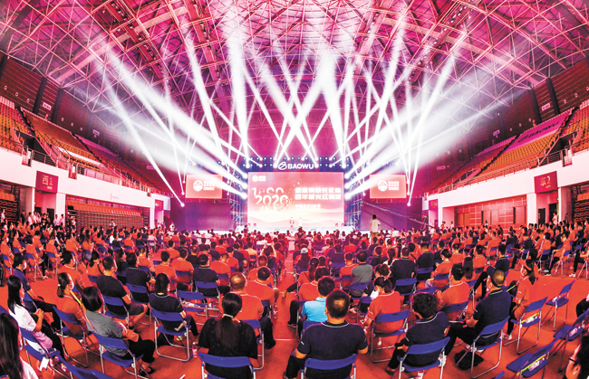 9月13日19点,在雄壮威武的中华人民共和国国歌声中,由武汉片区各单位自编自导自演的“重走钢铁长征路 百年薪火红钢城”中国宝武130年武汉片区主题展演在武钢体育中心火热开场。图为展演现场。(施琮 摄)