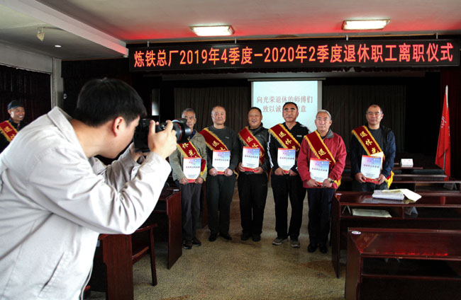 10月16日,鞍钢股份炼铁总厂工作人员为退休职工拍摄离职前最后一张合影(如图)。当天,该厂为2019年四季度至2020年二季度退休的125名职工举行了隆重的离职仪式。自2014年以来,该厂共为1039名退休职工举办了离职仪式。(姚晔/文 黄献东/摄)
