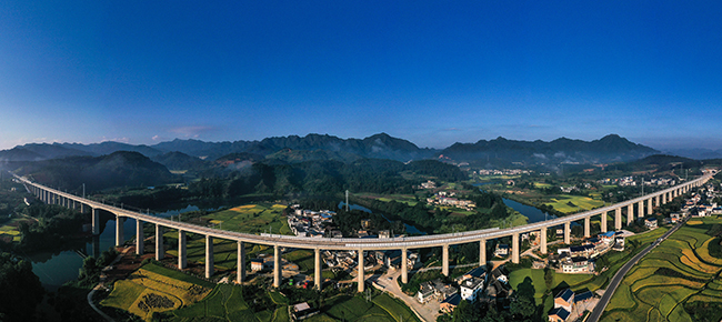 8月31日,中国宝武宝钢股份武钢有限助力建设的贵南高铁,实现全线贯通运营。贵南高铁的开通, 将南宁东到贵阳东的旅行时间由原来的5个多小时缩短至最快2小时53分。据悉,这条铁路全长482公里,武钢为其供轨6.86万吨,占全线铺轨量的59%。其中,百米高速钢轨6.78万吨,占比高达98.8%。图为8月31日拍摄的位于贵州省都匀市境内的贵南高铁营盘清水河双线特大桥。 (王文君/文 杨文斌/摄)