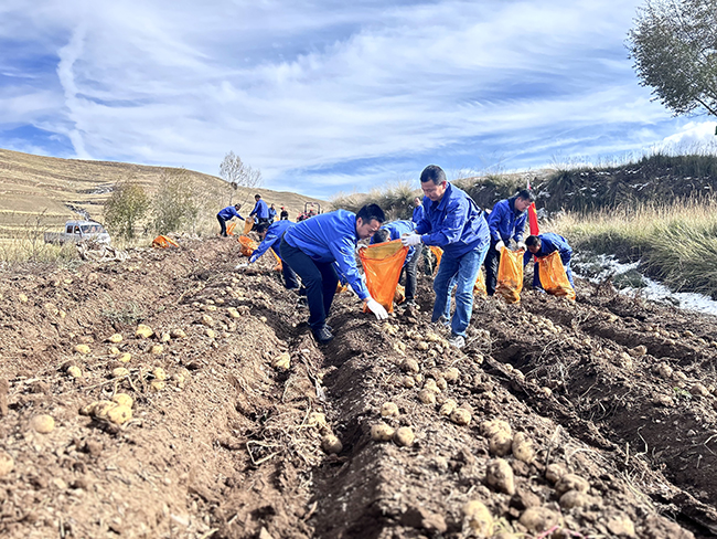 10月中旬以来,随着甘肃省武威市古浪县山区气温急剧下降, 酒钢集团帮扶乡镇古浪县横梁乡部分农户土豆面临滞销。酒钢乡村振兴驻村帮扶工作站快速响应,组织全体驻村干部在古浪县南部山区土豆种植基地开展“为民办实事” 帮销活动。该工作站协调酒钢集团公司帮扶办鼓励干部职工积极认购,同时多方联系帮扶单位同事及身边的亲戚朋友购买,共计帮销土豆35吨。图为酒钢驻村干部在帮助村民收土豆。(王斌先 摄)