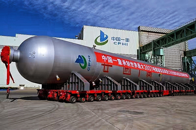 11月11日,由中国一重集团大连核电石化有限公司承制的浙江石化3037吨超级浆态床锻焊加氢反应器完工发运(如图)。该产品的成功制造再次刷新了世界锻焊加氢反应器的极限制造纪录,标志着我国超大吨位石化装备制造技术继续领跑世界。这台超级浆态床锻焊加氢反应器重达3037吨,总长达70.7米,外径为6.15米,壁厚为0.32米,是目前世界单重最大的锻焊加氢反应器,其安装完成后可实现炼制过程绿色化、低碳化、精准化、高效化。(孙远平/文 王亚东/摄)