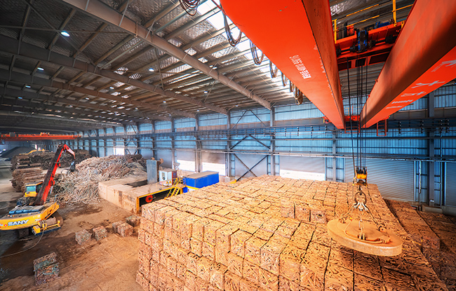 11月20日,位于安徽马鞍山的欧冶链金马钢诚兴公司员工正在加工吊运废钢铁打包块(如图)。今年初以来,欧冶链金通过建立金属再生资源加工配送示范基地,不断提高废钢铁综合利用水平。今年前10个月,欧冶链金实现废钢经营规模4500万吨,超过去年全年水平。(特约通讯员 张明伟 摄)