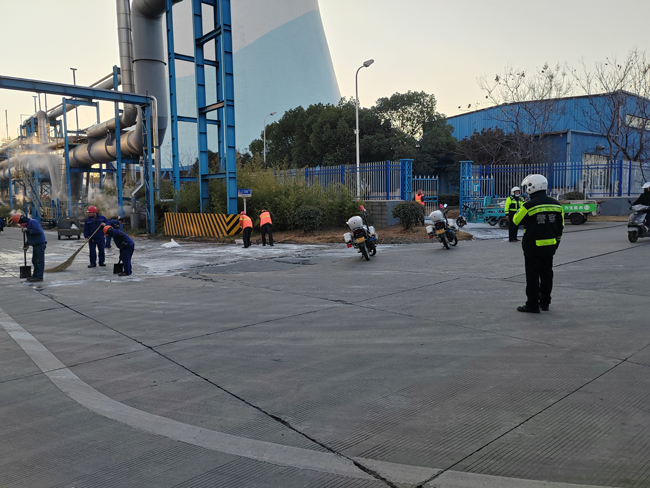 1月23日凌晨6时许,马钢北区二厂西路交叉路口由于冷却塔上冻水溢流淌,造成路面大面积结冰,致使该路段形成较大的交通安全隐患,马钢保卫部交管巡逻大队紧急抽调队员对现场进行安全管控,指挥过往行人、电瓶车及货运车辆缓慢通行,至7时30分,在交巡队员与该厂作业人员和现场环卫工人一同铲除结冰、撒盐消融后恢复正常通行。(记者 章利军/文 通讯员 张新勇/摄)