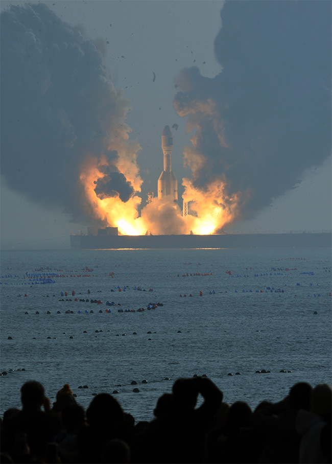 1月11日,人们在山东省海阳市连理岛上观看海上火箭发射(如图)。1月11日13时30分,我国太原卫星发射中心在山东海阳附近海域使用“引力一号”遥一商业运载火箭,将搭载的云遥一号3颗卫星顺利送入预定轨道,飞行试验任务获得圆满成功。为此次发射承担运输任务的液压动力模块运输车(SPMT)是宝钢工程旗下苏州大方特种车股份有限公司自主研发的,适用于石油化工、船舶大型分段、公铁预制桥梁、高炉等领域的超大物件运输。(李紫恒 摄)