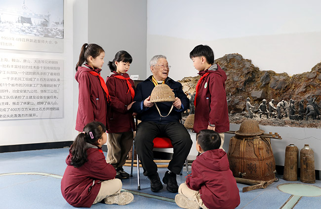 今年是新中国成立75周年,为大力弘扬伟大抗战精神、缅怀革命先烈、传承红色基因,3月23日,南钢集团党委邀请抗战老兵、南钢离休老干部王生同志到南京钢铁博物馆进行爱国主义精神宣讲。图为党龄82年、今年已99岁高龄的王生为前来参观的小学生讲述自己参加抗战和建设南钢的故事。(特约通讯员 吴斌 摄)