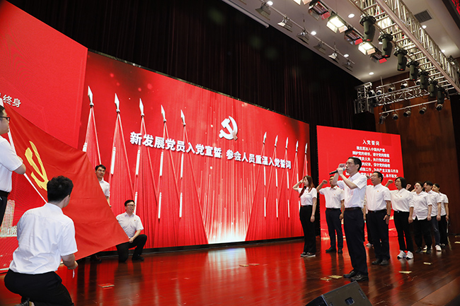 6月26日,中国宝武武钢集团党委召开庆祝建党103周年座谈会暨“两优一先”表彰会。2023年初以来,武钢集团“坚持质量与数量并重,严把入口关;坚持培训与教育并行,加强培养关;坚持监督和审查并进,突出审核关”,共发展党员38人。图为武钢集团领导带领部分新发展党员进行入党宣誓,全体参会党员集体重温入党誓词现场。(袁毅/文 李耀荣/摄)