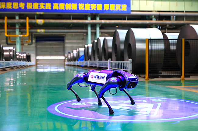 传统钢厂巡检工头戴安全帽、手持检测仪深入生产现场的画面,正在被新的场景取代。11月4日,在广西钢铁集团(柳钢防城港基地)冷轧厂车间,一只机器狗正自如地行走在无人天车区域,执行设备巡检任务(如图)。这是该厂继部署25套机器视觉系统、24台产线机器人、12台5G远控及无人行车后,在“数智化+精益化”深度融合上的又一创新实践——通过具备自主导航与AI(人工智能)识别能力的机器狗,实现高危区域巡检的完全无人化,以科技创新 推动生产效率和产品质量提升。(本报记者 顾学超 摄)