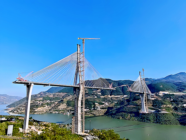 11月17日,奉建高速控制性工程——大溪河特大桥两岸引桥施工已完成,正式进入主塔钢节段拼装阶段(如图)。据了解,大溪河特大桥位于重庆市奉节县与巫山县交界处,跨越大溪河,桥梁全长1624米,主跨为650米。其中,奉节岸主塔高312.4米,巫山岸主塔高296.4米,为目前在建的亚洲第一跨度双边工字形组合梁斜拉桥。全桥预计于2025年12月底合龙,2026年6月具备通车条件。中国宝武中南股份重庆钢铁凭借过硬的产品质量与高效的服务,成为大桥建设所需中厚板的供应商,助力“钢铁巨龙”腾飞。 (尹聪/文 胡晓/摄)