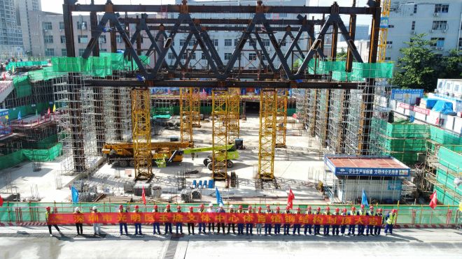 2023年9月23日,随着最后一根钢结构桁架稳稳升空吊装到位,由中国五冶集团有限公司承接的深圳市光明区玉塘文体中心新建项目体育馆桁架区及以下钢结构全面封顶,标志着本项目取得阶段性进展,进入主体结构封顶的冲刺阶段。