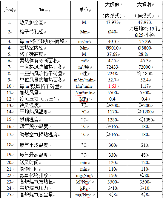 朝阳钢铁3#热风炉大修前后性能参数对比表