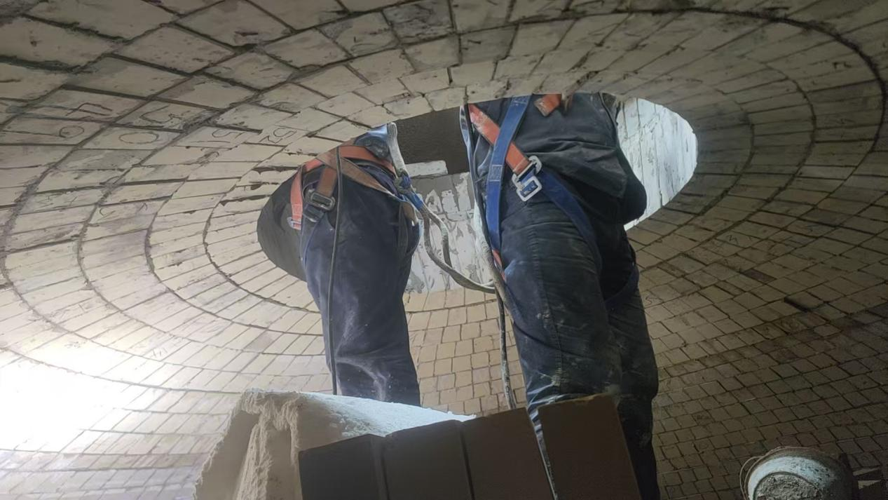 图为鞍钢集团朝阳钢铁厂2580立方米高炉内燃式热风炉炉壳利旧顶燃式改造砌筑悬链线拱顶时过程