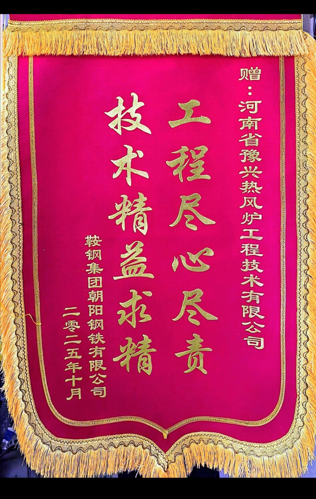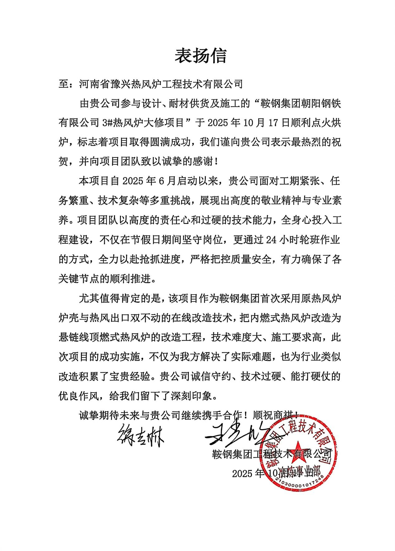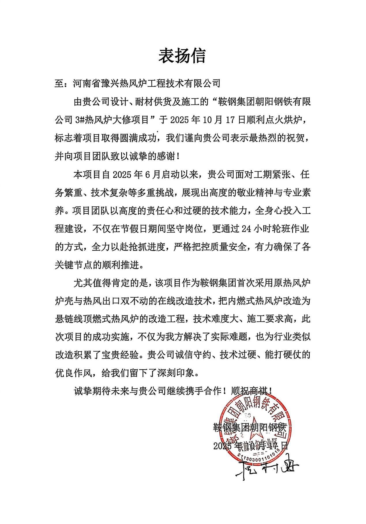 本次的优化改造的热风炉技术特点和质量、工期,得到了鞍钢集团朝阳钢铁厂的高度认可和赞誉,并给予豫兴公司“工程尽职尽责、技术精益求精”的锦旗、并在表扬信函中给予“贵公司诚信守约、技术过硬、能打硬仗的优良作风”的极大鼓励,这将激励鞍钢工程和豫兴工程更加紧密合作,为今后行业技术改造工程奠定臻实基础。