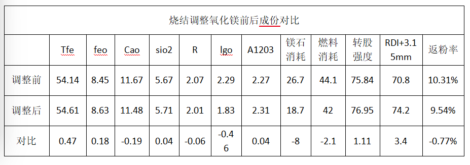 2.1.1降低MgO前后数据对比:烧结矿品位升高0.47%,MgO降低0.46%,碱度降低0.06%。