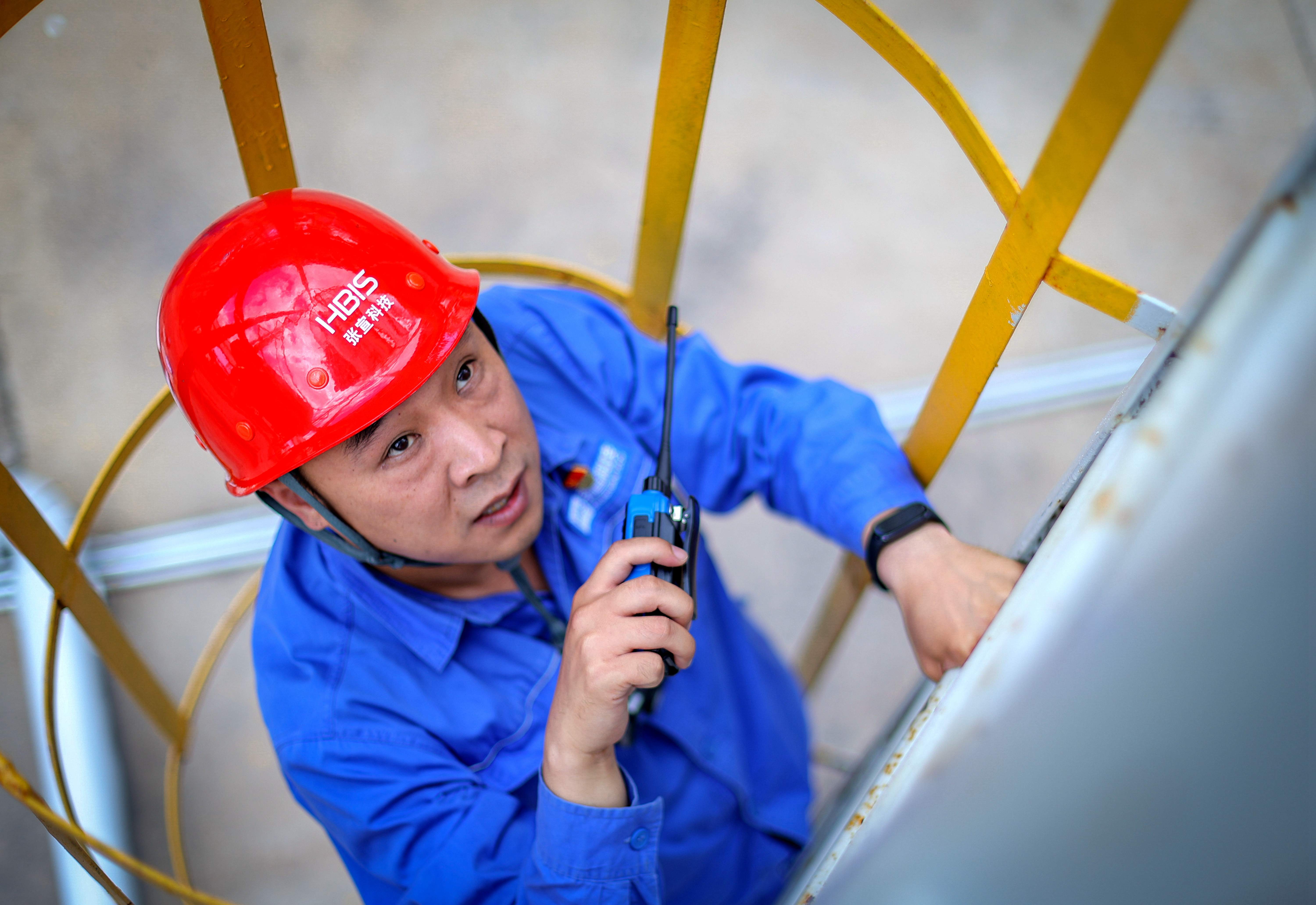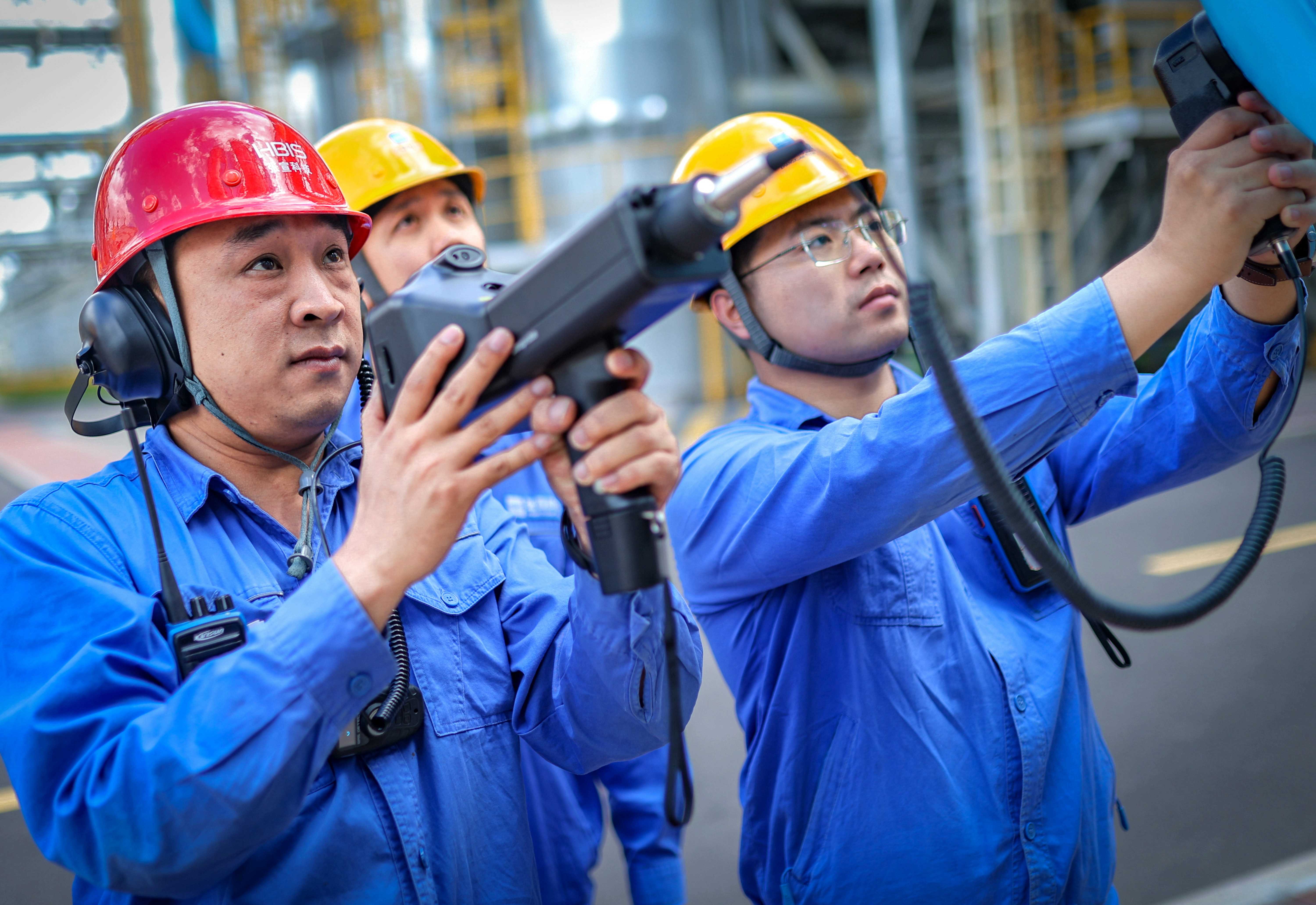 李利杰和团队在生产区域用超声波功能检测仪检测高温高压系统管道运行情况