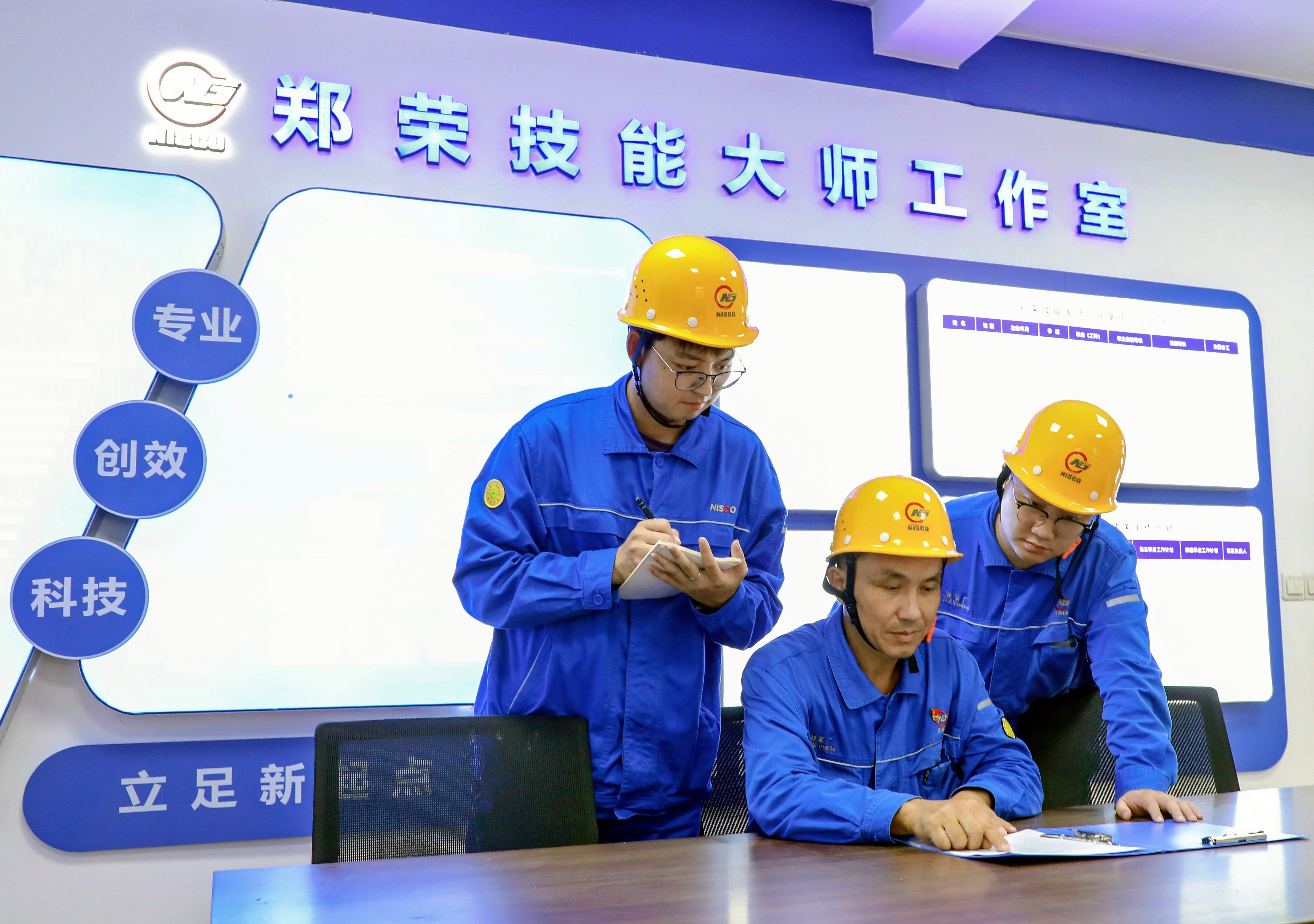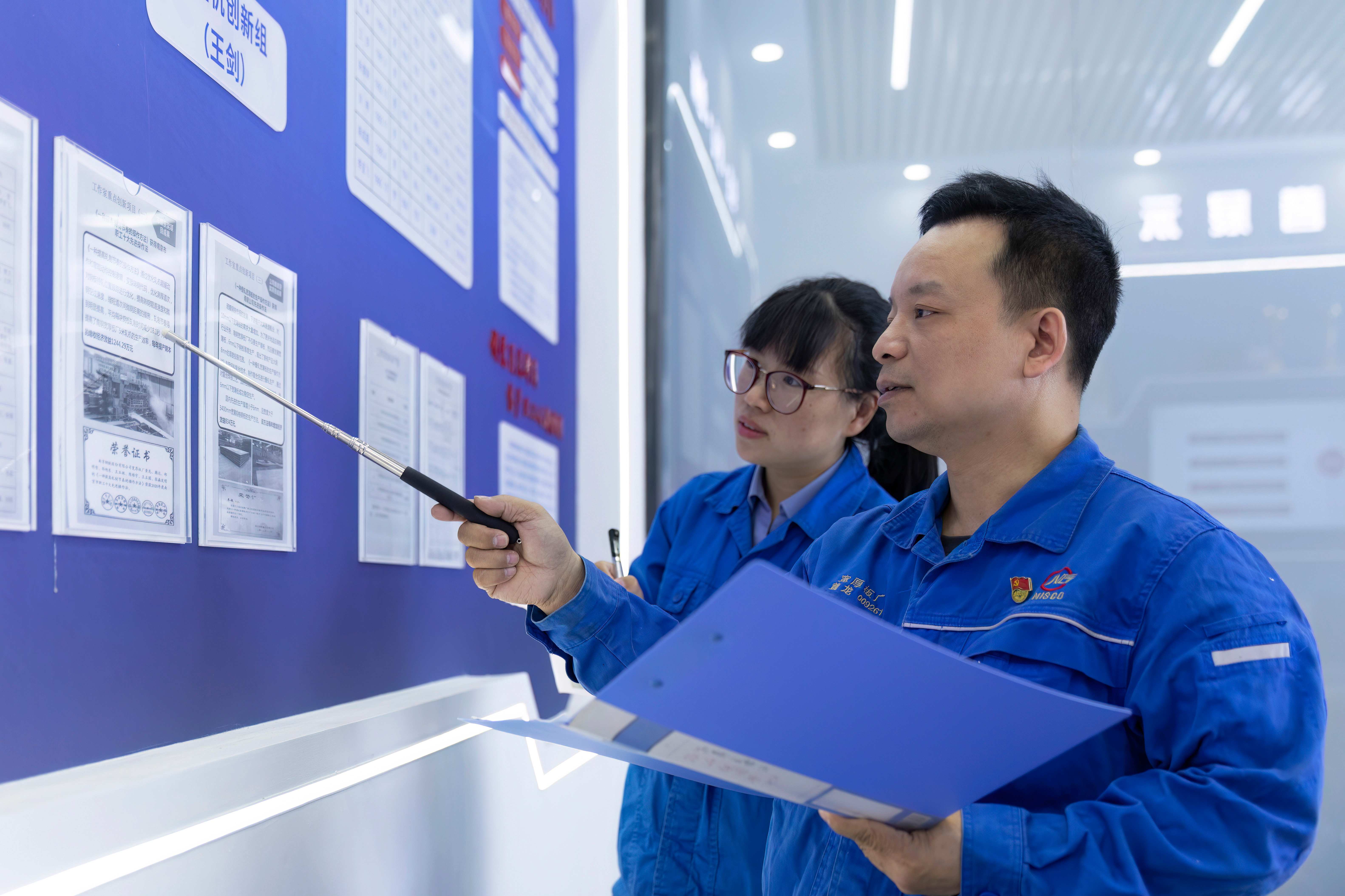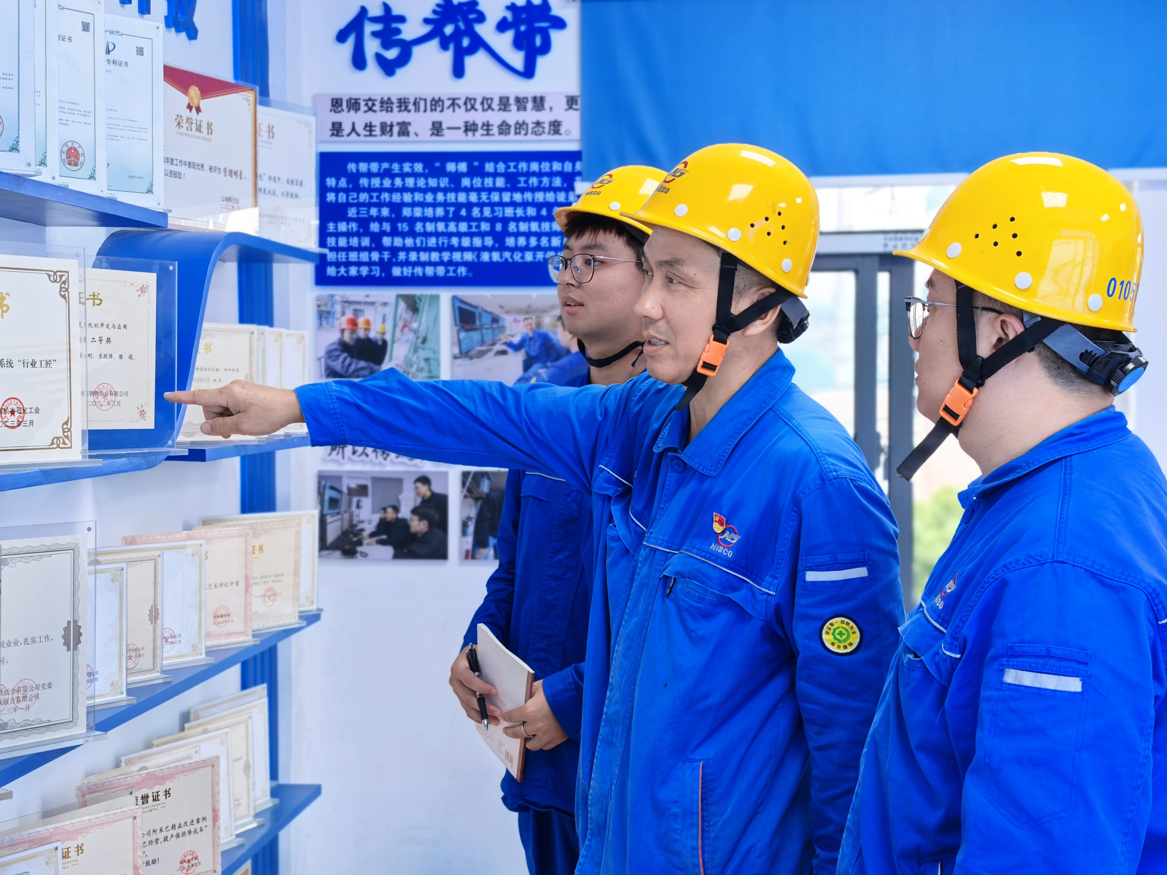 2025年9月8日,在郑荣技能大师创新工作室荣誉墙前,领衔人郑荣自豪的向工作室成员介绍创新工作室取得各项成果和荣誉。